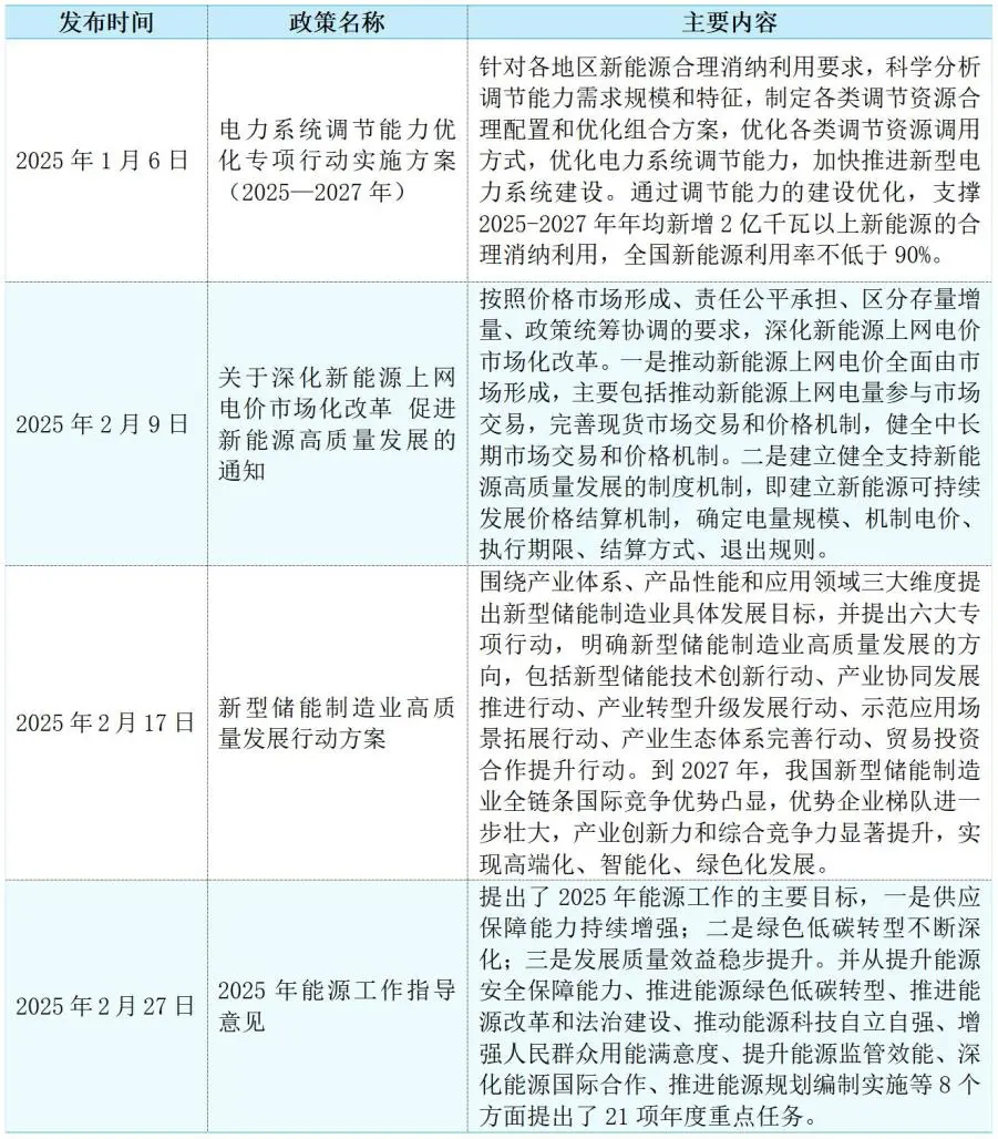 2025年開年以來,我國儲能相關政策頻發,政策體系加快完善,預計系列政策將對今年乃至未來一段時間我國新型儲能產業發展造成深刻影響。