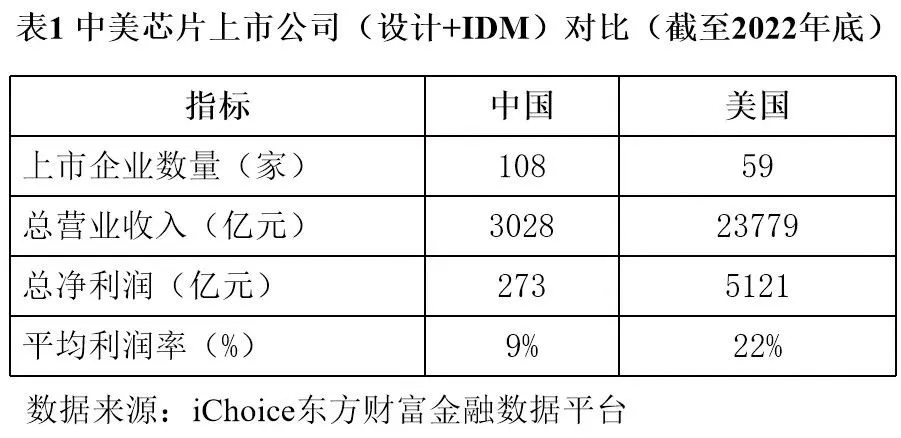 二是低端化競爭嚴重。如表1所示,根據2023年上半年已經上市的108家設計企業的半年報數據,108家企業中虧損的企業數量高達42家,2022年設計領域全部上市企業的總營收和總凈利潤分別是美國上市芯片企業(設計+IDM企業)的12.7%和5.3%,平均利潤率相差近3倍。低利潤率的原因在于大量設計企業在產品端缺乏差異化創新,只能進行價格戰,同時企業數量短時間內大量擴張引發人才和供應鏈資源的激烈“爭奪”,造成成本的快速上漲。
