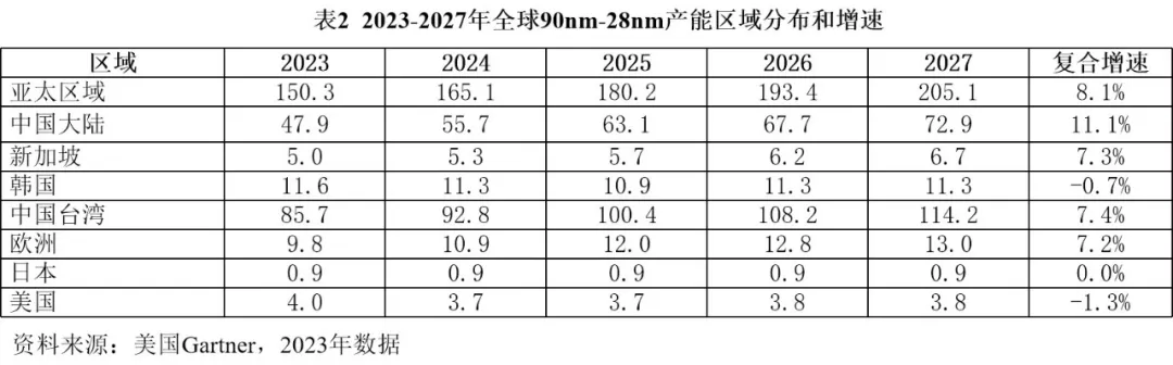 二是我國集成電路產能擴充集中在90納米-28納米工藝節點。根據Gartner數據,2023-2027年我國90納米-28納米成熟工藝代工產能在全部成熟工藝代工產能中擴產規模最快,達到11.1%(見表2)。另外根據美國“集微咨詢”數據,目前我國已經建成和在建的規劃產能基本以90納米-28納米成熟工藝為主。2027年,90納米-28納米成熟工藝產能在我國總產能中占比將達到57.9%。