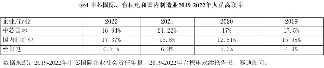 一是人才資源內耗嚴重。產業“內卷化”勢必會帶來嚴重的人才內耗,尤其是對于制造業、設備材料業這些本就人才總量嚴重不足,高端人才捉襟見肘的領域傷害更大。近年來國內的“建廠潮”,導致制造業人員離職率居高不下,如表5所示,近4年制造業人員離職率持續在15%以上,是臺積電人才流失率的2-3倍。而國內制造業龍頭中芯國際在2020年、2021年兩個“建廠”大年,人員離職率相比國內制造業平均水平高出5個百分點。