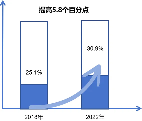 從增加值看,2018年全市高精尖產(chǎn)業(yè)實現(xiàn)增加值7610.3億元,占地區(qū)生產(chǎn)總值比重為25.1%;2022年全市高精尖產(chǎn)業(yè)實現(xiàn)增加值12857.8億元,占地區(qū)生產(chǎn)總值比重達到30.9%[2],較2018年提高5.8個百分點。