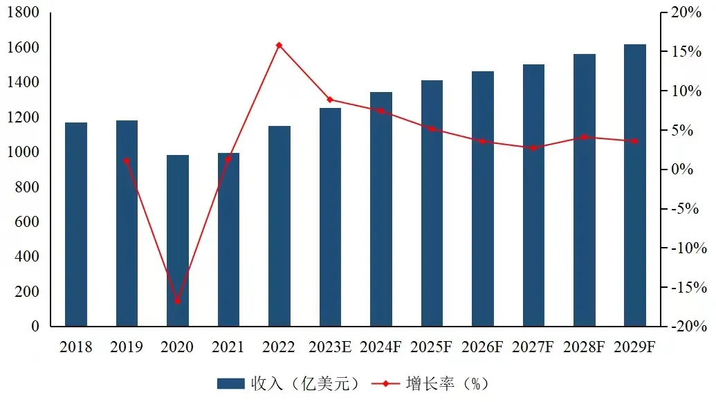根據第三方機構整理和預測,在全球范圍,2022年全球航空維修市場規模為1149.27億美元,預測到2029年將達到1616.73億美元,2023年到2029年復合增長率約4.37%。在全國層面,近幾年,中國航空維修產業得到了蓬勃發展,航空維修市場規模從2018年的94.37億美元增長到2022年的109.95億美元。預測2023年到2029年年復合增長率約6%,航空維修產業迎來穩步增長階段。