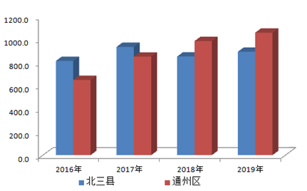 圖1 2016年-2019年北三縣和通州區地區生產總值比較(單位:億元)