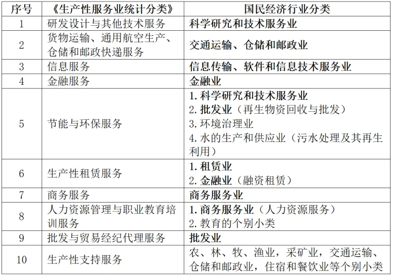 生產(chǎn)性服務(wù)業(yè)著重發(fā)展十大領(lǐng)域。2019年,國(guó)家統(tǒng)計(jì)局對(duì)《生產(chǎn)性服務(wù)業(yè)分類(lèi)(2015)》進(jìn)行修訂完善,印發(fā)《生產(chǎn)性服務(wù)業(yè)統(tǒng)計(jì)分類(lèi)(2019)》,明確生產(chǎn)性服務(wù)業(yè)共有十大類(lèi),即研發(fā)設(shè)計(jì)與其他技術(shù)服務(wù),貨物運(yùn)輸、通用航空生產(chǎn)、倉(cāng)儲(chǔ)和郵政快遞服務(wù),信息服務(wù),金融服務(wù),節(jié)能與環(huán)保服務(wù),生產(chǎn)性租賃服務(wù),商務(wù)服務(wù),人力資源管理與職業(yè)教育培訓(xùn)服務(wù),批發(fā)與貿(mào)易經(jīng)紀(jì)代理服務(wù),生產(chǎn)性支持服務(wù)。