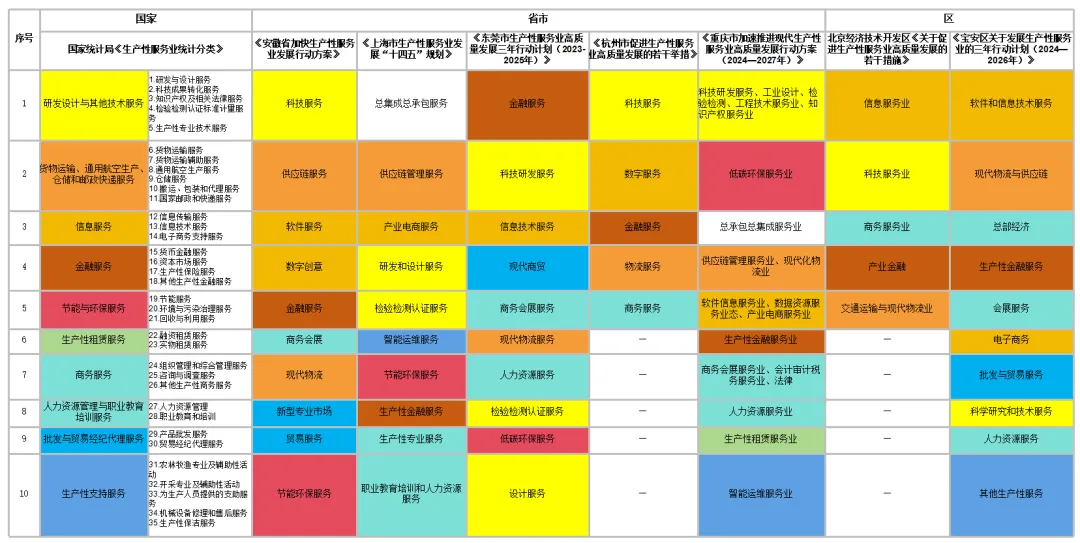圖1 國(guó)家及部分地區(qū)生產(chǎn)性服務(wù)業(yè)重點(diǎn)發(fā)展領(lǐng)域
