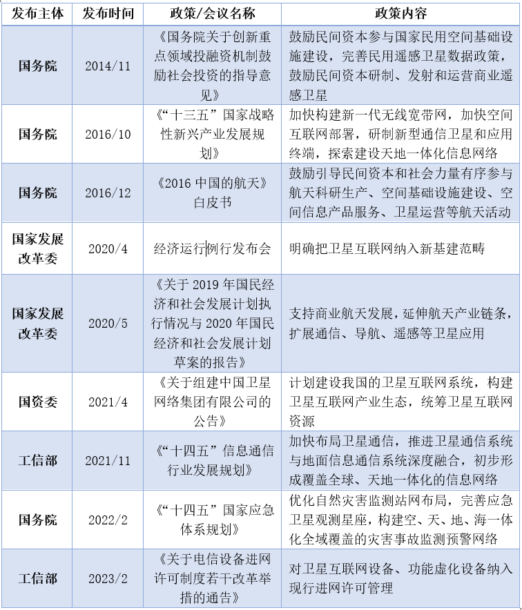 國家高度重視衛星互聯網發展。國家出臺一系列政策文件,為衛星互聯網產業發展提供政策支持和指導。2014年,國務院發布《關于創新重點領域投融資機制鼓勵社會投資的指導意見》,首次鼓勵民間資本積極參與衛星研制、發射和運營商業遙感衛星,標志著我國開始從政策層面鼓勵民營企業參與商業航天發展。2020年4月,國家發改委明確將衛星互聯網納入“新基建范疇”,作為新一代通信網絡設施的重要組成部分,與5G、物聯網、工業互聯網等并列。2021年11月,工信部發布《“十四五”信息通信行業發展規劃》,提出加快布局衛星通信,推進衛星通信與地面信息通信系統深度融合。2023年2月,工信部放開衛星互聯網設備進網許可管理,為衛星通信網絡的部署建設提供便利。