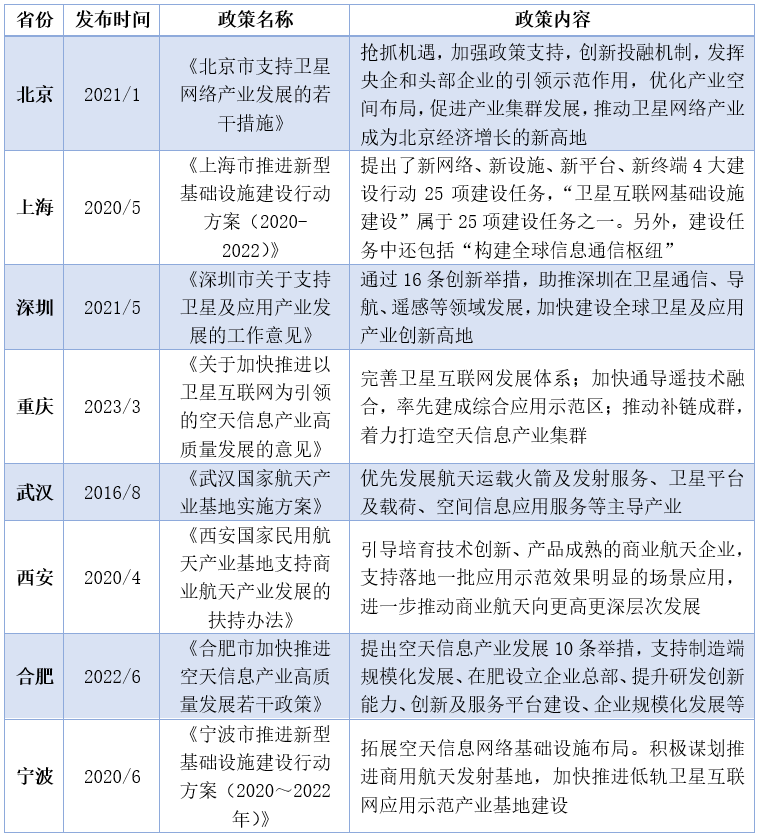 各地方省市積極搶抓產業發展先機。在國家大力推動衛星互聯網的發展之下,部分重點城市如北京、上海、深圳、重慶、武漢、西安、合肥、寧波等,紛紛制定衛星互聯網產業支持政策,積極爭取成為國內衛星互聯網產業的領軍者。