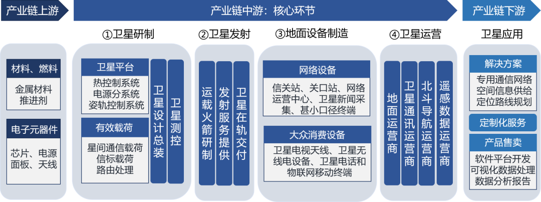 衛星互聯網核心產業的產業鏈主要包含衛星研制、衛星發射、地面設備、衛星運營及服務四大環節。向上延伸主要為材料、燃料、電子元器件,向下延伸主要為應用環節。