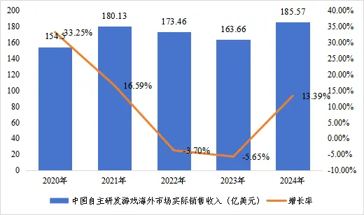 圖 1 近五年中國(guó)自主研發(fā)游戲海外市場(chǎng)實(shí)際銷(xiāo)售收入及增速