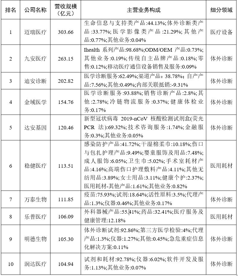 表1  2022年我國醫療器械上市企業營收規模TOP10
