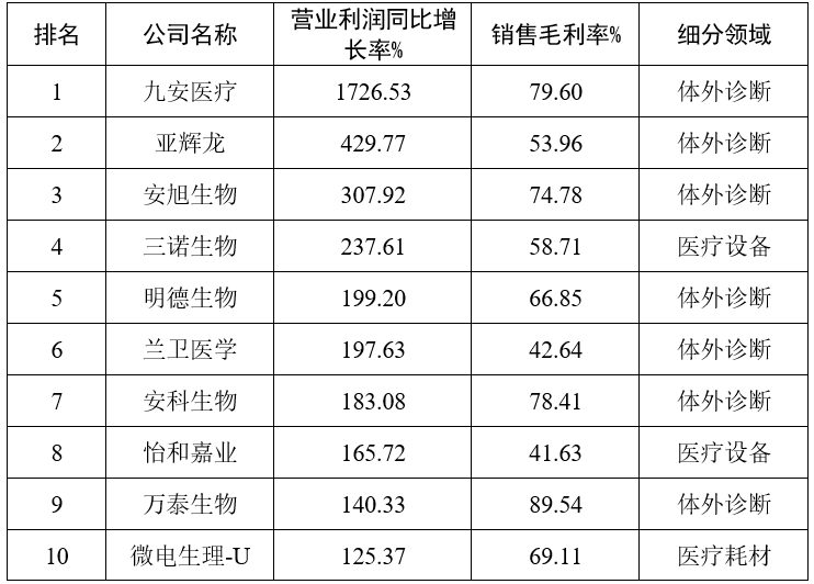 與此同時,行業毛利率繼續維持高位,利潤領域分化也愈發明顯。2022年行業銷售毛利率達53.9%,其中體外診斷領域營業利潤同比增長明顯,行業前10名中有8家屬于體外診斷領域。