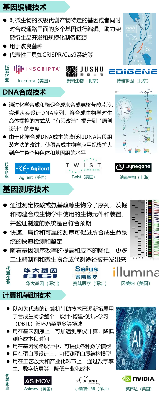 技術層的主要技術是指基因合成、基因編輯、蛋白質設計、細胞設計、高通量篩選等顛覆性使能技術,是支撐和推動合成生物學發展的關鍵。其中,基因組編輯技術、DNA合成以及基因測序是核心使能技術,此外,計算機輔助技術對合成生物學的推動作用也日益顯現。
