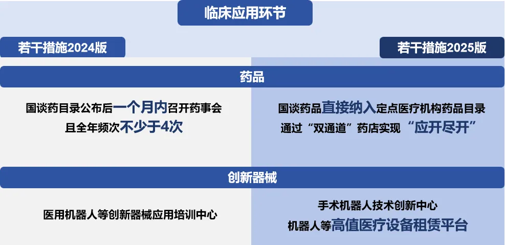 創(chuàng)新藥方面,相較于上海、廣東等地增加召開藥事會頻次,北京率先提出國談藥可直接納入全市定點醫(yī)療機構藥品目錄,無需召開藥事會,醫(yī)療機構可通過“雙通道”藥店實現(xiàn)“應開盡開”。此外,支持醫(yī)療機構針對創(chuàng)新價值高但臨床數(shù)據(jù)較少、實際證據(jù)不充分的藥物開展真實世界研究,驗證藥物臨床價值。創(chuàng)新醫(yī)療器械方面,搭建機器人等高值醫(yī)療設備租賃平臺,運用市場化方式打通創(chuàng)新醫(yī)療器械入院“最后一公里”,破解創(chuàng)新醫(yī)療器械高成本與推廣難的矛盾,加快手術機器人入院應用和創(chuàng)新迭代。